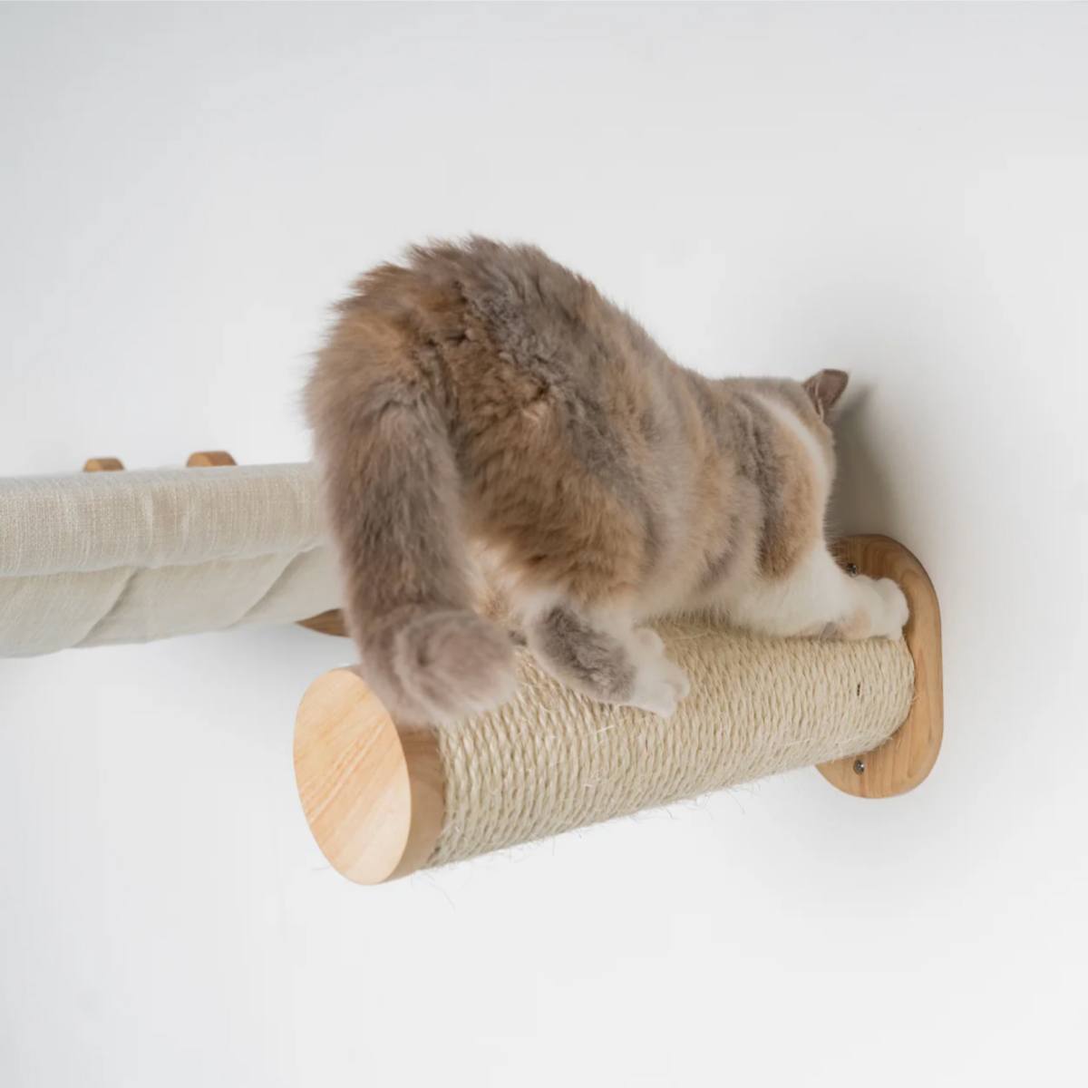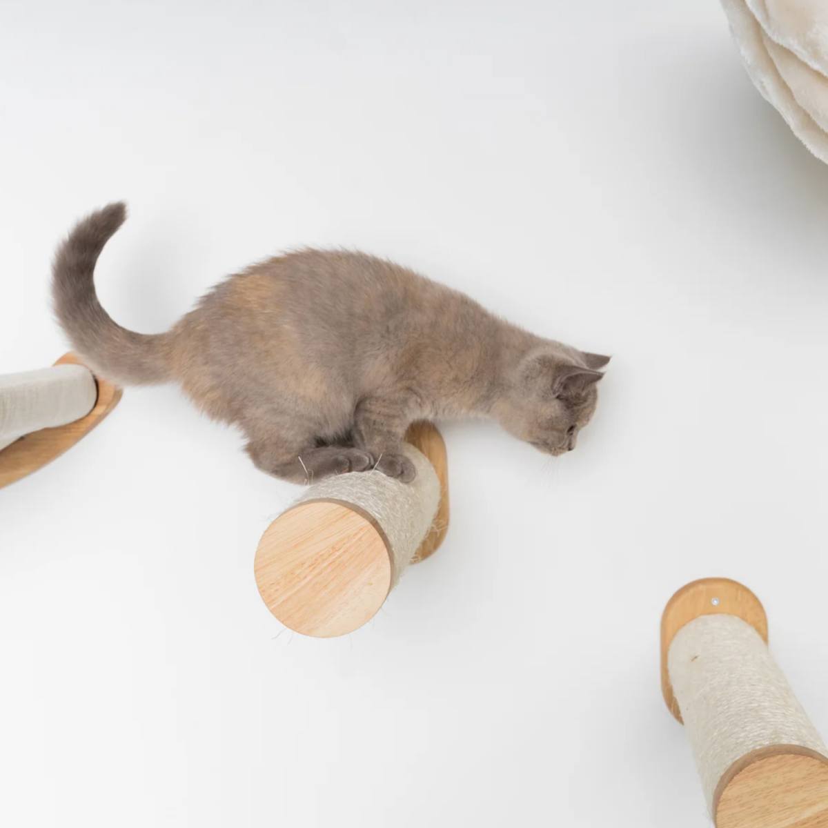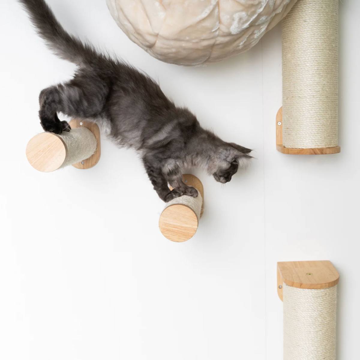 Su šiuo rinkiniu galite sukurti patogius laiptelius arba pilną laipiojimo kopėčių sistemą ant sienos. Kiekvieno stulpo sizalio ritės diametras – 9 cm, bendras gylis – 33 cm, todėl jie yra tvirti, stabilūs ir saugūs katei laipioti. Gražus kietmedžio apdailos paviršius ir užbaigimas prie stulpo galo – be matomų varžtų, o sizalio virvė priklijuota, todėl neišsivynioja.